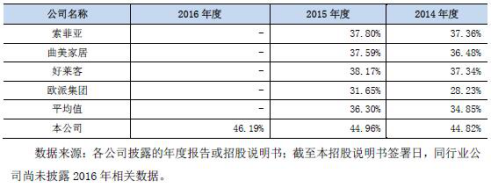 2014至2016應(yīng)收賬款周轉(zhuǎn)率及存貨周轉(zhuǎn)率與同行業(yè)公司對比(來源:招股書) 2013年至2016年,尚品宅配綜合毛利率分別為47.01%、44.82%、44.96%和 46.19%,高于同行業(yè)公司的平均水平,2014至2016年,同行業(yè)公司綜合業(yè)務(wù)毛利率平均值為34.85%和36.30%。