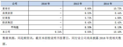 2014年至2016年與同行業(yè)上市公司銷售費用率比較(來源:招股書) 2014至2016年,尚品宅配管理費用分別為20,049.20萬元、27,946.81萬元、37,183.51萬元,管理費用率分別為10.48%、9.05%、9.24%,高于行業(yè)平均水平。2014年和2015年管理費用率同行業(yè)平均值為8.13%和8.33%。