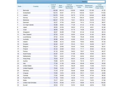 據(jù)臺灣“中央社”報道,百慕大以昂貴的生活成本與租金,最終以150.38總分取代居首位多年的瑞士,后者以138.16居次;冰島與挪威則分別以130.79及112.75排名第3及第4,巴哈馬則排名第5。第6至第10依序是丹麥、美屬維爾京群島、日本、以色列及新加坡。臺灣則以66.80分排名第34名,主要是因為雜貨成本及本地采購力日漸提高因素。