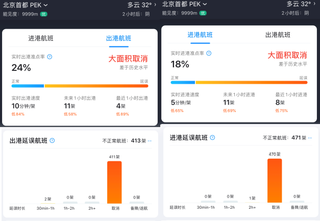 受各大航空公司退票處置方案的影響,航班大面積取消。飛常準(zhǔn)數(shù)據(jù)顯示,截至6月22日15時(shí)15分,北京首都國(guó)際機(jī)場(chǎng)當(dāng)日出港航班大面積取消,實(shí)時(shí)出港準(zhǔn)點(diǎn)率僅為24%,413架不正常航班中有411架航班取消出港;同樣,當(dāng)日入港航班大面積取消,實(shí)時(shí)入港準(zhǔn)點(diǎn)率僅為18%,471架不正常航班中有470架航班取消入港。