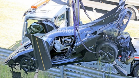 科尼塞克早上發(fā)布消息稱One:1打算在紐北刷新最快圈速紀錄。知情人表示,刷圈過程中,車輛在高速駛?cè)階denauer Forst彎時發(fā)生失控,車身撞跨賽道左側(cè)的護欄,進而飛入草地,事故令One:1車身損毀嚴重,前保險杠折斷、擋風玻璃破碎,尾部受損。