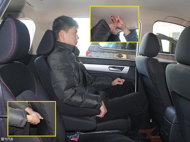第二排為兩個獨(dú)立座椅,座椅填充和前排保持一致,乘坐感受同樣舒適,頭枕高度可調(diào)。前排座椅位置保持不變,同一位模特坐進(jìn)第二排,頭部空間剩余一拳三指,腿部空間剩余一拳兩指。