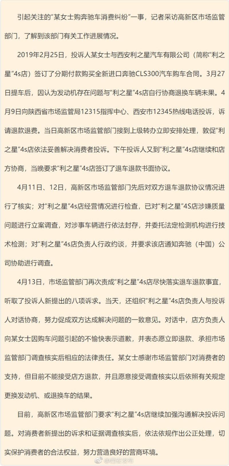 據(jù)西安市互聯(lián)網信息辦公室官方微博消息稱,4月13日,高新區(qū)市場監(jiān)管部門曾組織利之星4S店負責人與投訴人進行對話協(xié)商。對話中,店方負責人向奔馳女車主因購車問題引起的不愉快表示道歉,并表態(tài)愿立即退款、承擔市場監(jiān)管部門調查核實后相應的法律責任。該奔馳女車主感謝市場監(jiān)管部門對消費者的支持,但目前不能接受店方退款,也愿意接受調查核實以后依照有關規(guī)定更換發(fā)動機、或退換車的結果。
