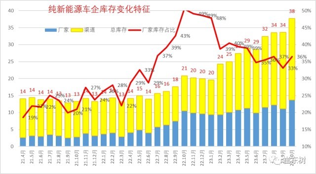從僅生產新能源車的企業(yè)的庫存變化特征分析看,2023年年初庫存20萬,年初的庫存保持較好,總體新能源庫存在2月后開始持續(xù)地上升,目前上升到10月末的38萬臺水平。近期主要增長的是經(jīng)銷商庫存,這也是經(jīng)銷模式為主流進行新能源銷售的結果。