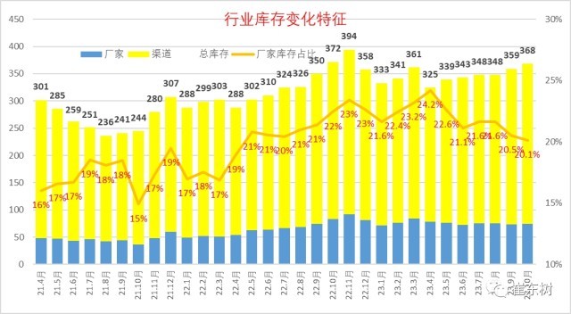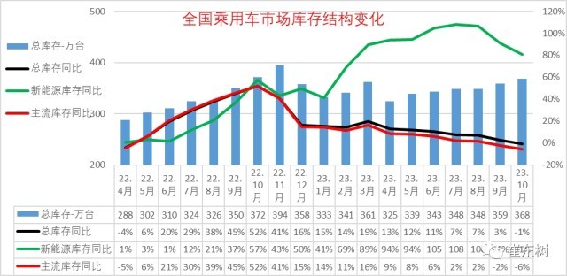 根據(jù)乘聯(lián)會的數(shù)據(jù),2023年10月月末全國乘用車庫存368萬臺,其中廠家?guī)齑?4萬臺,渠道庫存294萬臺,廠家?guī)齑嬲急?0.1%,較2022年10月下降1.9個百分點,環(huán)比上月下降0.4個百分點。