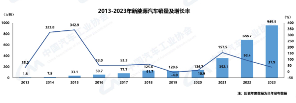 據(jù)中汽協(xié)統(tǒng)計分析,2023年我國新能源汽車產銷分別完成958.7萬輛和949.5萬輛,同比分別增長35.8%和37.9%,市場占有率達31.6%。
