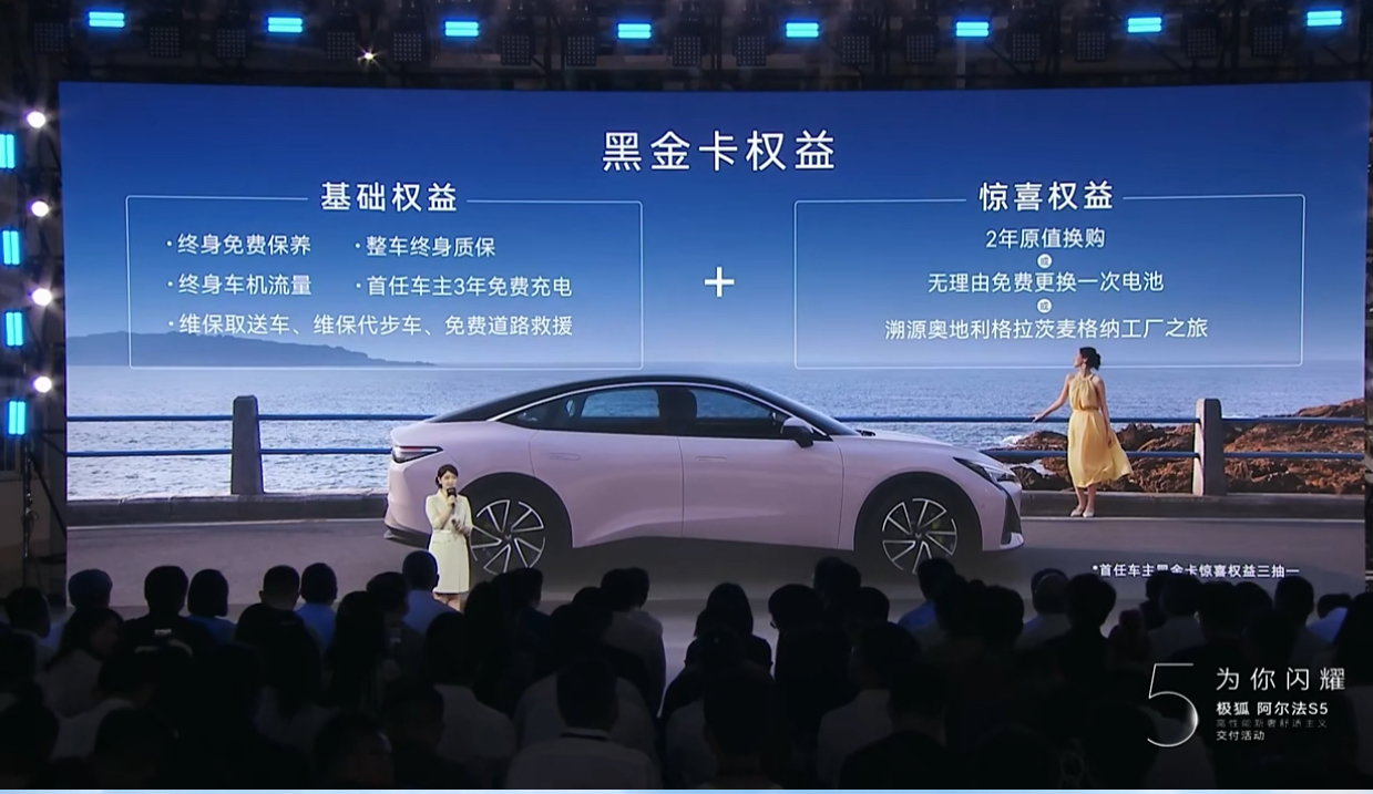 阿爾法S5交付的同時(shí),“三巨頭”還為首批用戶帶來(lái)價(jià)值不菲的黑金卡權(quán)益,包括終身免費(fèi)保養(yǎng)、首任車主3年免費(fèi)充電、免費(fèi)道路救援,以及2年原值換購(gòu)、無(wú)理由免費(fèi)更換一次電池、溯源奧地利格拉茨麥格納工廠之旅等實(shí)打?qū)嵉暮枚Y,并且此后還將定期抽取幸運(yùn)用戶持續(xù)發(fā)放黑金卡權(quán)益,開(kāi)創(chuàng)汽車行業(yè)交付價(jià)值感的新境界。