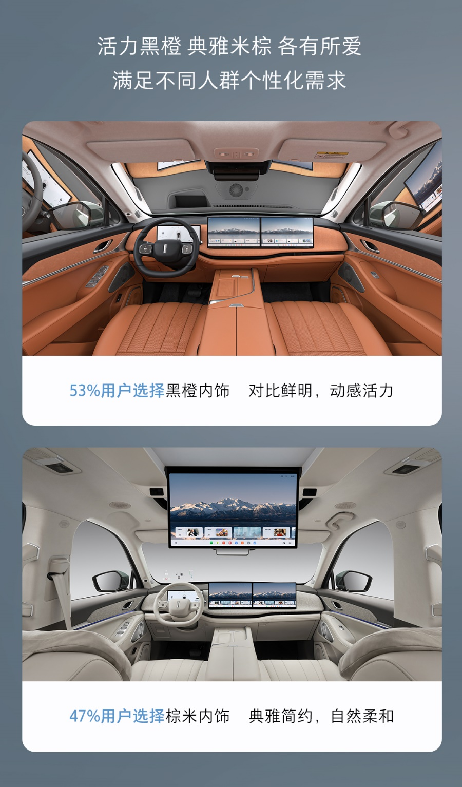 在內(nèi)飾方面,黑橙搭配占比53%,既保留了黑色的神秘感,又融入了橙色的活力元素,整體風(fēng)格不失優(yōu)雅大氣,又充滿動(dòng)感與生機(jī),彰顯出對(duì)比鮮明、溫暖陽(yáng)光的空間氛圍;棕米內(nèi)飾則以47%的占比,為車艙營(yíng)造一抹精致與高雅,高級(jí)質(zhì)感,一眼望去平和寧?kù)o,營(yíng)造出自然柔和的家庭氛圍,同樣符合更多用戶的審美需求。