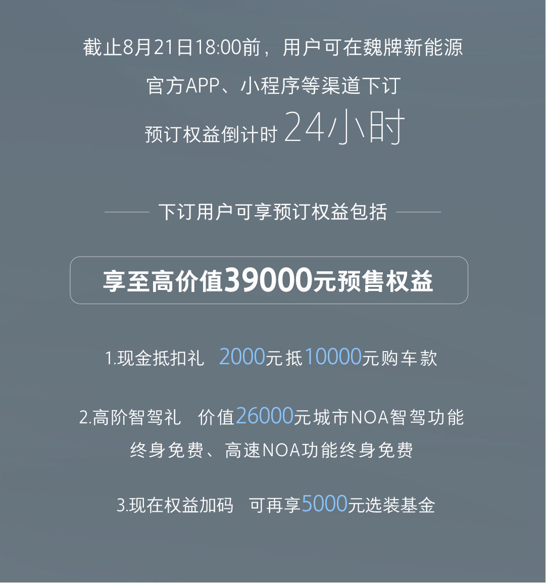 8月21日魏牌全新藍(lán)山上市,預(yù)訂權(quán)益正式進(jìn)入倒計(jì)時(shí),截至8月21日18:00前,可以在魏牌新能源官方APP、小程序等渠道下訂。下訂用戶可享至高價(jià)值39000元預(yù)售權(quán)益,含現(xiàn)金抵扣禮(2000元抵10000元購(gòu)車款),高階智駕禮(價(jià)值26000元城市NOA智駕功能終身免費(fèi),高速NOA功能終身免費(fèi)),現(xiàn)在還有現(xiàn)時(shí)權(quán)益加碼,可再享5000元選裝基金。還在糾結(jié)配置的用戶,抓緊下訂吧。