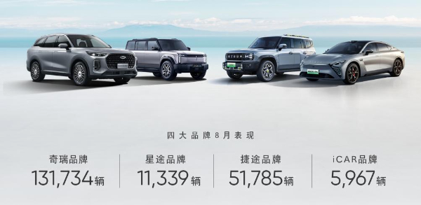 從品牌來看:四大主力乘用車品牌中,奇瑞品牌8月銷量131,734輛,1-8月累計銷量961,624輛,同比增長34.8%;星途品牌8月銷量11,339輛,1-8月累計銷量80,229輛,同比增長22%;捷途品牌8月銷量51,785輛,1-8月累計銷量316,446輛,同比增長95.5%,這一數(shù)字已超過捷途去年全年銷量;iCAR品牌首款產(chǎn)品上市6個月,8月份銷量5,967輛;今年以來累計銷量37,681輛。