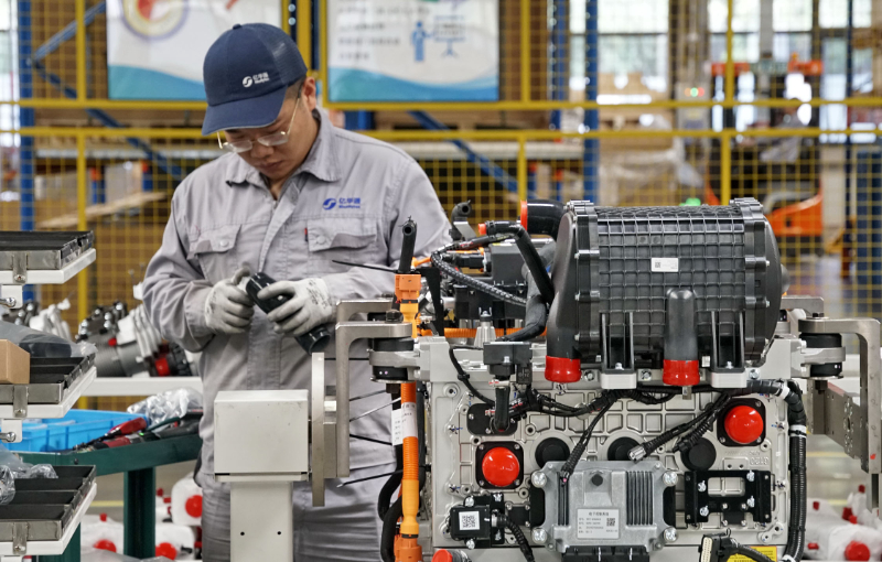 圖為在北京大興國際氫能示范區(qū)內(nèi),一家生產(chǎn)氫能燃料電池發(fā)動機(jī)企業(yè)的員工在裝配設(shè)備。新華社記者 李欣 攝