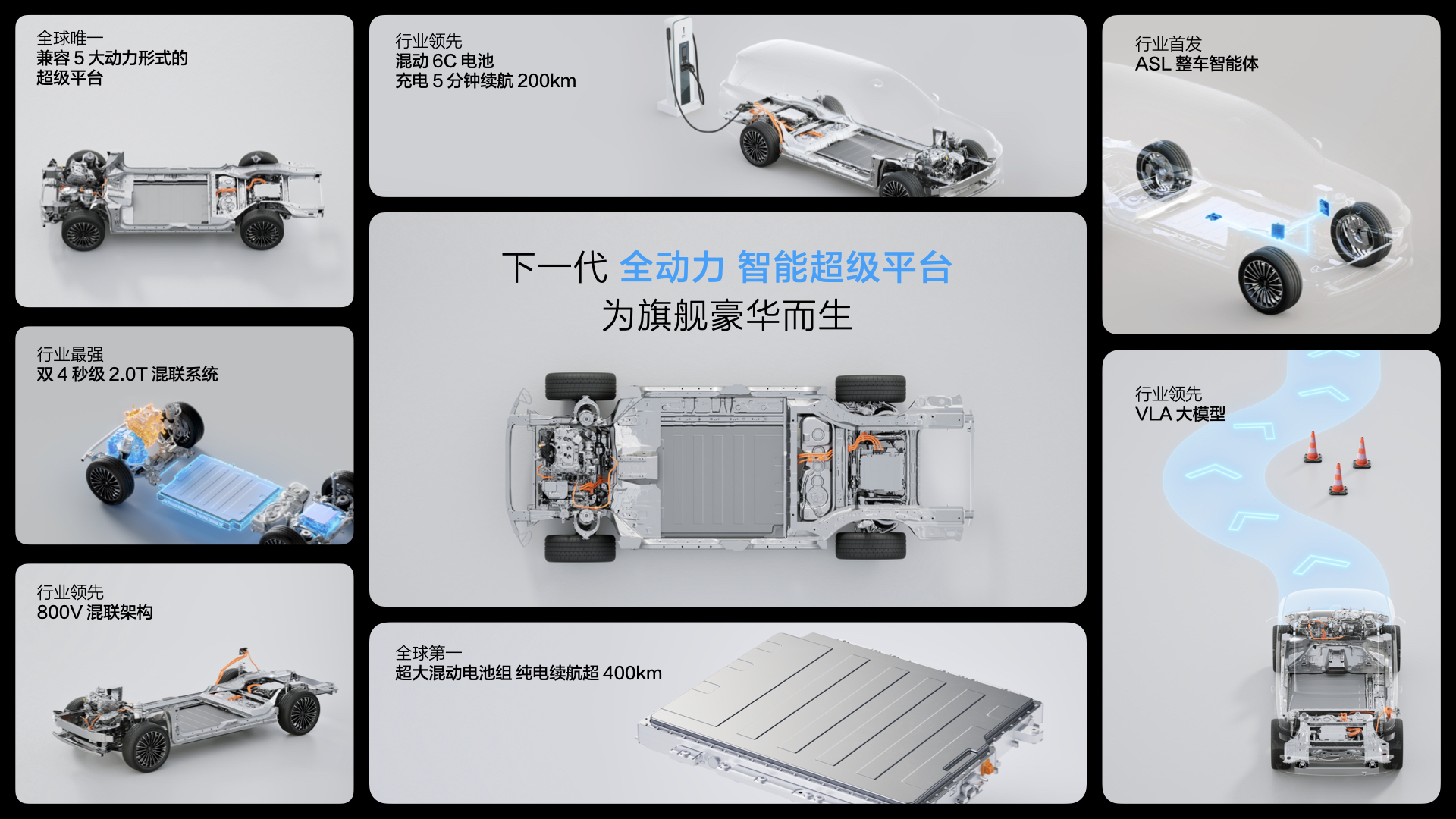 該平臺(tái)具備七大領(lǐng)先優(yōu)勢(shì),分別是,兼容5大動(dòng)力形式的超級(jí)平臺(tái);雙4s(秒)級(jí)2.0T超級(jí)混聯(lián)系統(tǒng);800V混聯(lián)架構(gòu);超大混動(dòng)電池組,純電續(xù)航超400km;混動(dòng)6C電池,充電5分鐘續(xù)航200km;行業(yè)首發(fā)的整車(chē)智能體以及行業(yè)領(lǐng)先的VLA大模型、