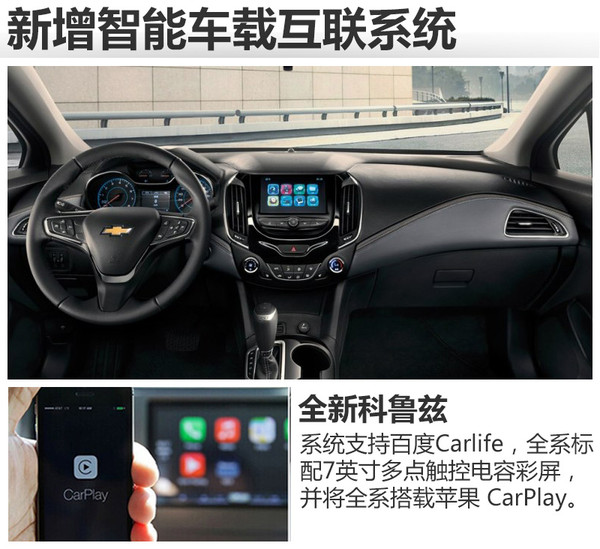在配置方面,新車搭載了新一代MyLink智能車載互聯(lián)系統(tǒng),支持百度Carlife,全系標配7英寸多點觸控電容彩屏,并將全系搭載蘋果 CarPlay。全新科魯茲還將新一代安吉星Onstar智能行車伙伴和4G LTE原裝集成車載Wi-Fi,可同時接入多個設備。