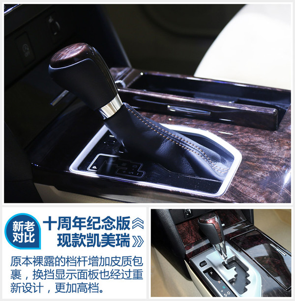 凱美瑞的“蛇形”換擋機(jī)制一直是筆者非常喜歡的設(shè)計,最起碼在開車的時候不會因為換錯擋而發(fā)生意外碰撞。但是說實話,裸露的檔桿總覺得缺了點什么。十周年紀(jì)念版將檔桿周圍加上了皮質(zhì)包裹,立馬將中控臺的“氣質(zhì)”提升了一個檔次,筆者本人是非常喜歡的。另外,副駕駛面前的木紋面板也增加了一條鍍鉻裝飾。