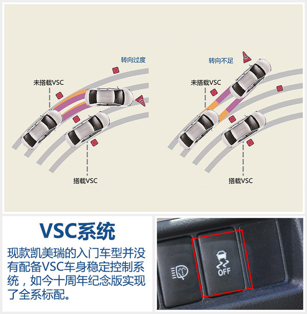 目前在售的現(xiàn)款凱美瑞入門版車型,并沒有配備VSC車型穩(wěn)定控制系統(tǒng),這對于預(yù)算有限的消費者來說,原本可以成為購買目標(biāo)的凱美瑞,很有可能就因為這一個配置被篩掉了。如今,十周年紀(jì)念版實現(xiàn)了全系車型標(biāo)配VSC系統(tǒng)。