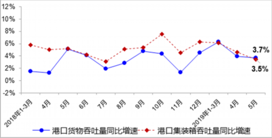 5月,全國港口完成貨物吞吐量12.0億噸,同比增長3.7%,其中內(nèi)、外貿(mào)吞吐量分別增長5.2%和0.9%;完成集裝箱吞吐量2240萬標(biāo)箱,同比增長3.5%。