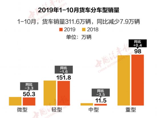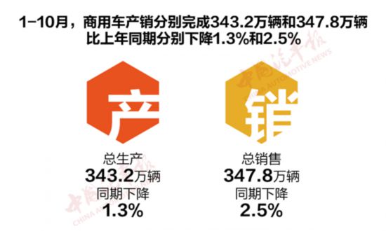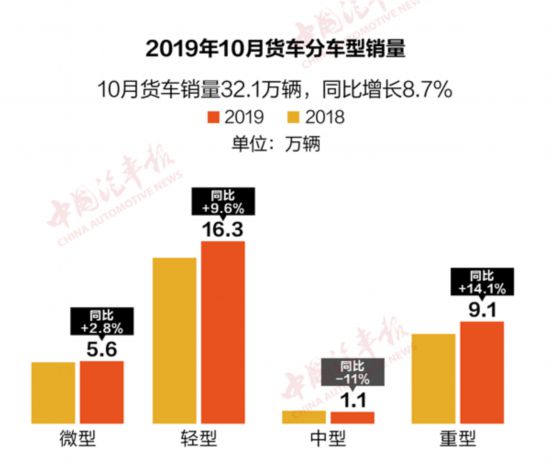10月整體汽車銷量繼續(xù)下滑,同比下降4%,在車市寒冬中,商用車回暖態(tài)勢明顯,在各地加快更新淘汰及投資拉動(dòng)等因素的影響下,本月商用車?yán)^續(xù)保持較好的增長勢頭,漲幅與9月相比有擴(kuò)大的趨勢。