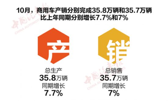 11月11日,中國汽車工業(yè)協(xié)會(huì)發(fā)布10月汽車產(chǎn)銷數(shù)據(jù)。商用車產(chǎn)銷分別完成35.8萬輛和35.7萬輛,比上月分別增長3.9%和4.8%,比上年同期分別增長7.7%和7%,與乘用車市場的“一片涼涼”相比,商用車產(chǎn)銷數(shù)據(jù)表現(xiàn)亮眼,市場加速回暖。