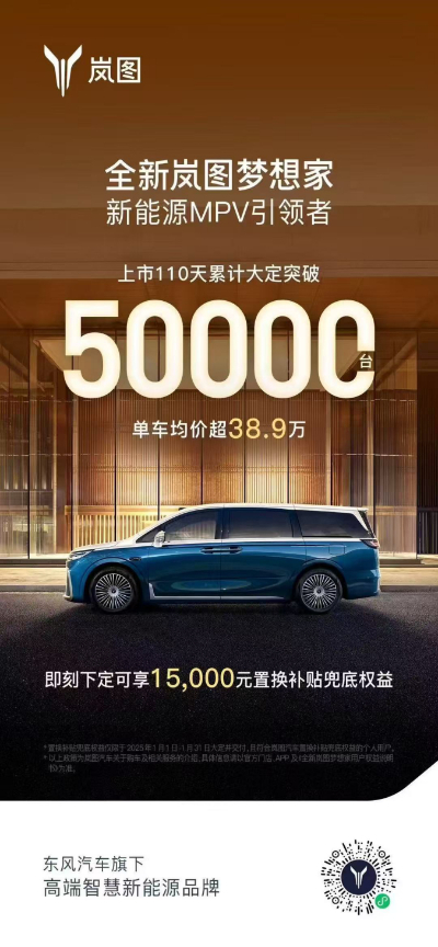 作為嵐圖汽車的“明星產(chǎn)品”,全新嵐圖夢(mèng)想家的市場(chǎng)表現(xiàn)可圈可點(diǎn)。去年9月19日,全新嵐圖夢(mèng)想家正式上市,不僅助推嵐圖汽車當(dāng)月銷量突破萬(wàn)輛,且后續(xù)幾個(gè)月延續(xù)熱銷態(tài)勢(shì)。10-11月蟬聯(lián)新能源MPV銷量冠軍,12月單一車型銷量突破萬(wàn)輛,上市110天累計(jì)大定更是突破5萬(wàn)臺(tái),創(chuàng)造了歷史,也使得嵐圖汽車坐穩(wěn)月銷過(guò)萬(wàn)的“寶座”,駛?cè)敫哔|(zhì)量發(fā)展快車道。