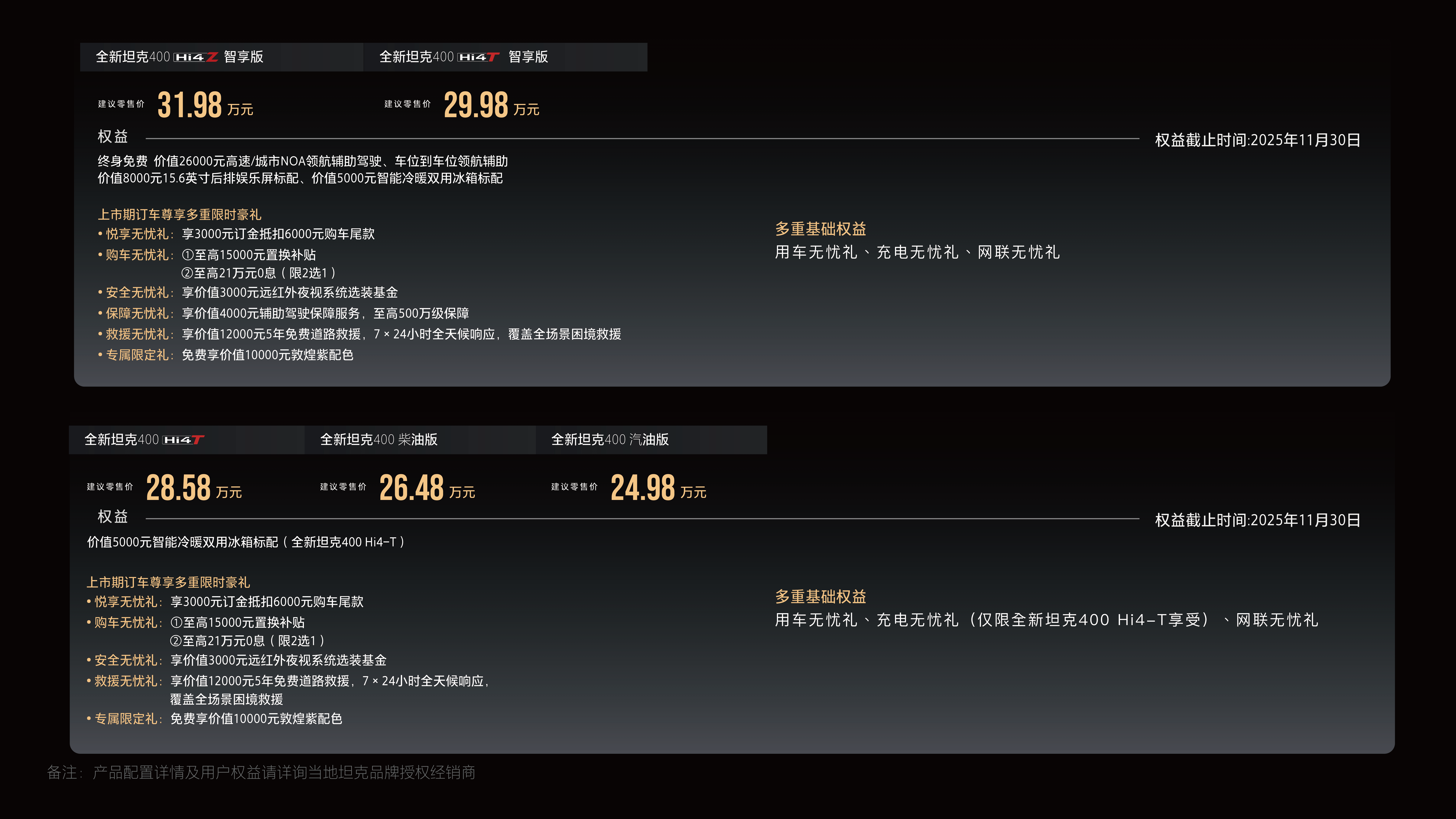全新坦克400 Hi4-Z智享版,售價(jià)31.98萬(wàn)元;全新坦克400 Hi4-T智享版,售價(jià)29.98萬(wàn)元;全新坦克400 Hi4-T,售價(jià)28.58萬(wàn)元;全新坦克400 柴油版,售價(jià)26.48萬(wàn)元;全新坦克400 汽油版,售價(jià)24.98萬(wàn)元。即刻下單可享多重尊崇權(quán)益,坦克以滿滿誠(chéng)意為用戶帶來驚喜購(gòu)車優(yōu)惠。