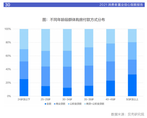 《報告》還顯示,消費客群普遍通過加杠桿方式購房,受調(diào)群體中全款購房比例僅占 18.1%。對比不同年齡段群體看,25-39歲群體對杠桿的依賴度較高,貸款購房比例超過8成,其中30-34年齡段群體貸款比例最高,達87.4%。80前群體資金積累相較充足,對杠桿的依賴度相對較低,貸款比例未超過8成。95后父母多為60、70后,而這兩代人已經(jīng)有一定的財富積累,在購置房產(chǎn)時,有能力對子女進行資助,因此購房群體中全款購房比例相對較高。從購房群體的需求類型看,首次置業(yè)群體購房杠桿較高,貸款比例達86.6%。