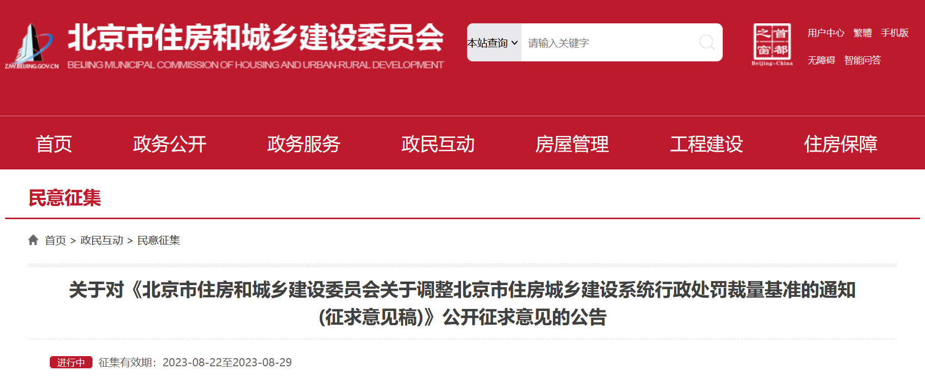 央廣網(wǎng)北京8月23日消息 據(jù)北京市住房和城鄉(xiāng)建設委員網(wǎng)站消息,為貫徹落實《建設工程質(zhì)量檢測管理辦法》《房地產(chǎn)開發(fā)企業(yè)資質(zhì)管理規(guī)定》相關處罰職權,北京市住房和城鄉(xiāng)建設委員會制定了《北京市住房和城鄉(xiāng)建設委員會關于調(diào)整北京市住房城鄉(xiāng)建設系統(tǒng)行政處罰裁量基準的通知(征求意見稿)》,現(xiàn)向社會公開征求意見。公開征集意見時間為:2023年8月22日至8月29日。