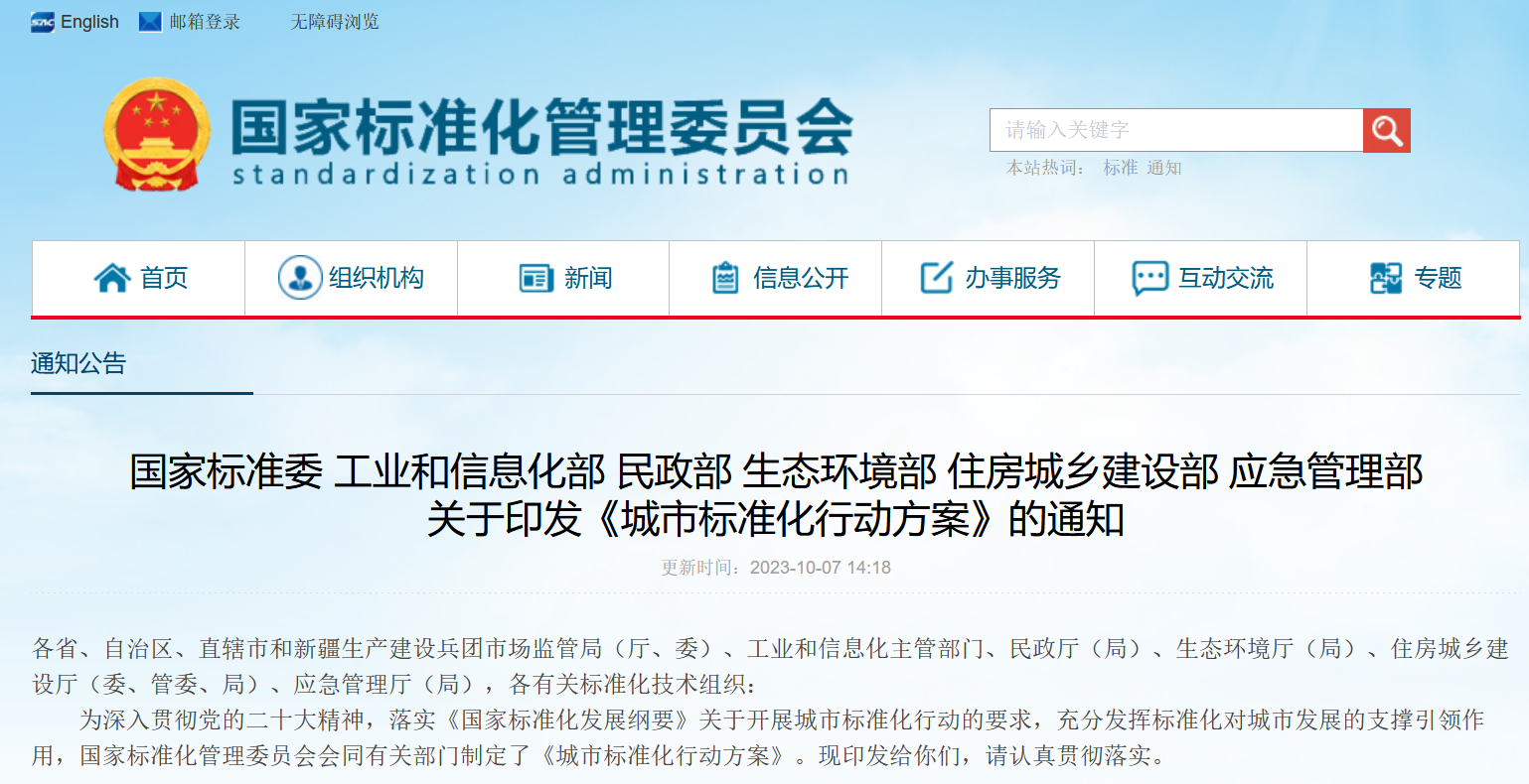央廣網北京10月8日消息 據國家標準化管理委員會網站消息,為落實《國家標準化發(fā)展綱要》關于開展城市標準化行動的要求,充分發(fā)揮標準化對城市發(fā)展的支撐引領作用,近日,國家標準化管理委員會會同工業(yè)和信息化部、民政部、生態(tài)環(huán)境部、住房城鄉(xiāng)建設部、應急管理部制定了《城市標準化行動方案》(以下簡稱《行動方案》)。
