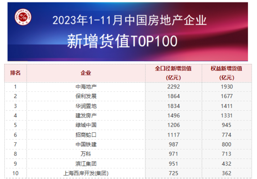 根據(jù)中指研究院數(shù)據(jù)顯示,中海地產(chǎn)、保利發(fā)展、華潤置地占據(jù)新增貨值榜單前三位。2023年1-11月,中海地產(chǎn)以累計(jì)新增貨值2292億元占據(jù)榜單第一;保利發(fā)展、華潤置地緊隨其后,累計(jì)新增貨值規(guī)模分別為1864億元和1834億元。TOP10企業(yè)2023年1-11月新增貨值總額13442億元,占TOP100企業(yè)的41.7%;TOP100企業(yè)新增貨值門檻為121億元。