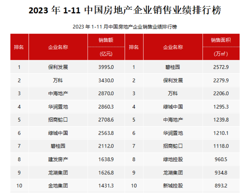 從企業(yè)表現(xiàn)來看,央國企銷售表現(xiàn)仍較為強(qiáng)勁。2023年1-11月,銷售額同比增長超過10%的大型企業(yè)為,中海、華潤、建發(fā)、越秀、華發(fā)、聯(lián)發(fā)、國貿(mào)地產(chǎn)、中建壹品、中建東孚、象嶼地產(chǎn)等,這些企業(yè)銷售增長較為強(qiáng)勁。