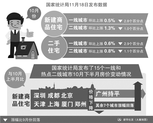 國家統(tǒng)計(jì)局城市司高級統(tǒng)計(jì)師劉建偉介紹,與10月份上半月比,10月份下半月新建商品住宅價(jià)格除深圳和成都2個(gè)城市繼續(xù)下降外,北京、天津、上海、廈門和鄭州等5個(gè)城市也由升轉(zhuǎn)降,降幅在0.1至0.4個(gè)百分點(diǎn)之間;其余7個(gè)城市新建商品住宅價(jià)格環(huán)比漲幅進(jìn)一步回落,回落幅度在0.4至3.3個(gè)百分點(diǎn)之間。