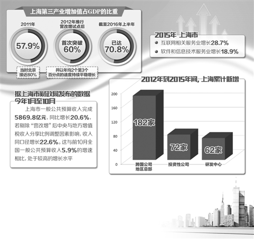 記者從上海市稅務(wù)局了解到,2012年推行營改增試點后,第三產(chǎn)業(yè)占GDP比重首次突破60%,并以年均2個至3個百分點的速度持續(xù)平穩(wěn)增長。截至2016年上半年,該比重已達70.8%。