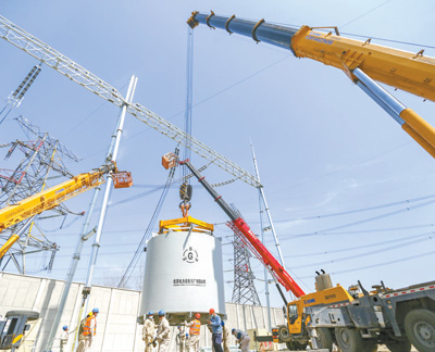 3月19日,江蘇梅里至惠泉500千伏線路加裝串聯(lián)電抗器工程施工現(xiàn)場(chǎng)。人民視覺(jué)