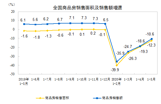 1—5月份,商品房銷售面積48703萬(wàn)平方米,同比下降12.3%,降幅比1—4月份收窄7.0個(gè)百分點(diǎn)。其中,住宅銷售面積下降11.8%,辦公樓銷售面積下降26.7%,商業(yè)營(yíng)業(yè)用房銷售面積下降21.7%。商品房銷售額46269億元,下降10.6%,降幅比1—4月份收窄8.0個(gè)百分點(diǎn)。其中,住宅銷售額下降8.4%,辦公樓銷售額下降35.3%,商業(yè)營(yíng)業(yè)用房銷售額下降26.6%。