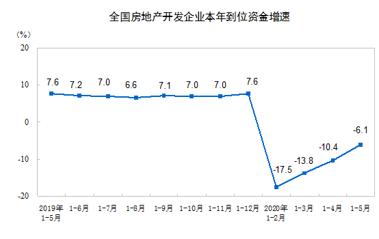 1—5月份,房地產(chǎn)開(kāi)發(fā)企業(yè)到位資金62654億元,同比下降6.1%,降幅比1—4月份收窄4.3個(gè)百分點(diǎn)。其中,國(guó)內(nèi)貸款10703億元,下降0.5%;利用外資34億元,增長(zhǎng)15.3%;自籌資金20106億元,下降0.8%;定金及預(yù)收款19479億元,下降13.0%;個(gè)人按揭貸款10154億元,下降0.9%。