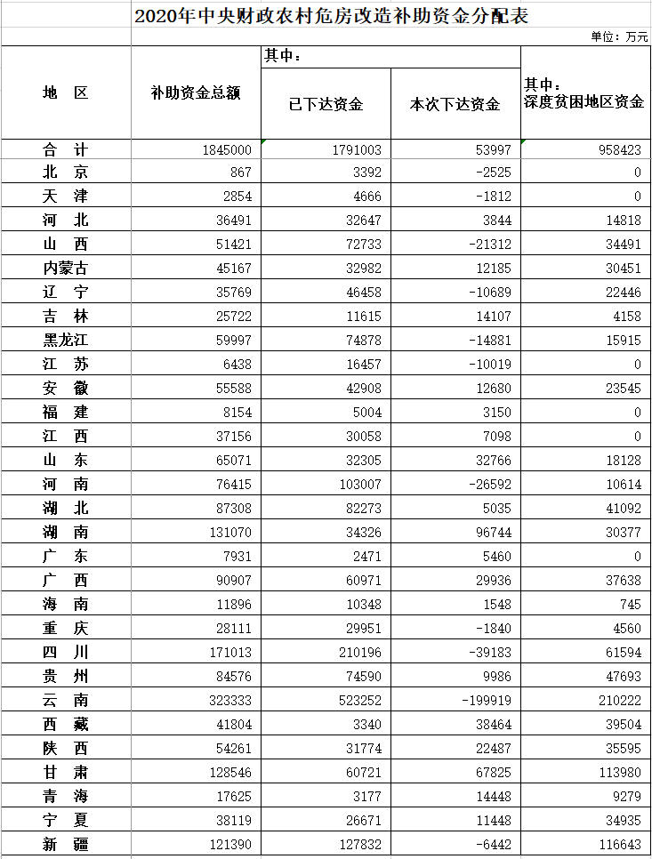 人民網(wǎng)北京6月18日電(記者孫紅麗) 近日,財(cái)政部、住房城鄉(xiāng)建設(shè)部聯(lián)合發(fā)布《關(guān)于下達(dá)2020年中央財(cái)政農(nóng)村危房改造補(bǔ)助資金預(yù)算的通知》?!锻ㄖ凤@示,29個(gè)省份補(bǔ)助資金總額為184.5億元。