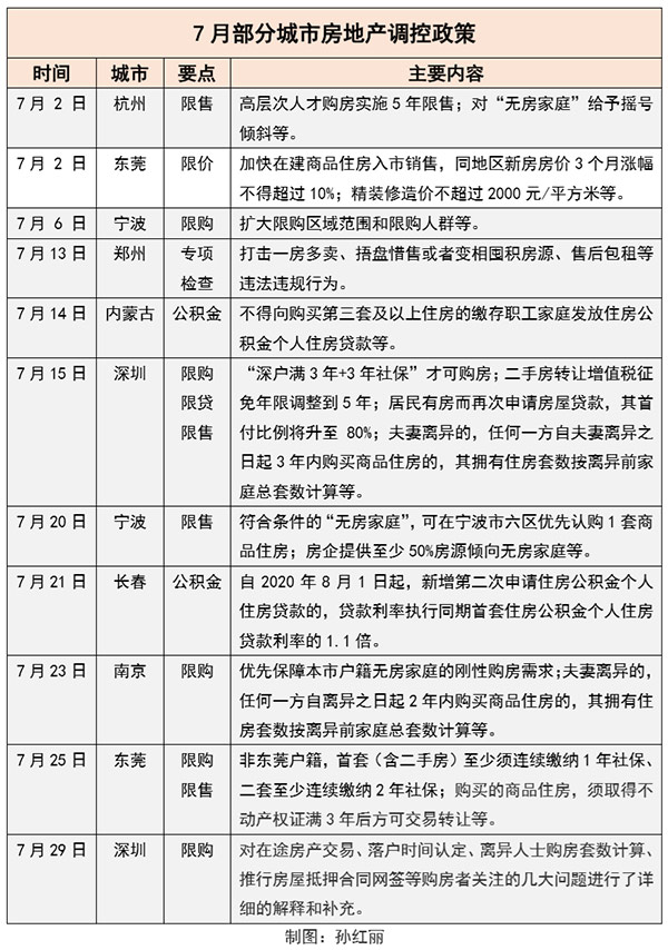 記者梳理發(fā)現(xiàn),7月以來,多個(gè)城市圍繞收緊購房資格、限制資金違規(guī)進(jìn)入房地產(chǎn)、支持無房家庭購房、抑制投機(jī)炒房等方面進(jìn)行調(diào)控。