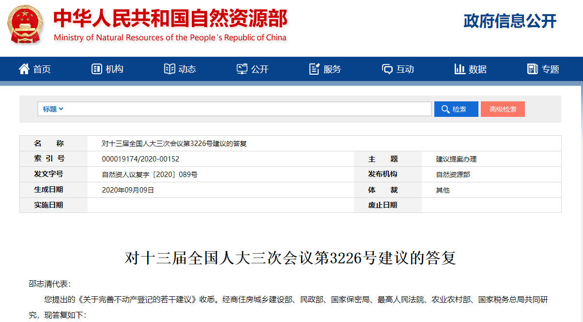您提出的《關(guān)于完善不動產(chǎn)登記的若干建議》收悉。經(jīng)商住房城鄉(xiāng)建設(shè)部、民政部、國家保密局、最高人民法院、農(nóng)業(yè)農(nóng)村部、國家稅務總局共同研究,現(xiàn)答復如下: