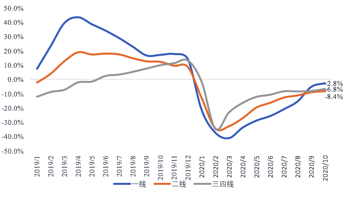 貝殼研究院統(tǒng)計整理數(shù)據(jù)顯示,截止2020年10月一線城市新房市場成交量恢復逐漸放緩,其中成交套數(shù)累計同比下滑2.8%、成交面積累計同比下滑1.8%;二線城市成交套數(shù)累計同比下滑8.4%、成交面積累計同比下滑9.5%;三四線城市成交套數(shù)累計同比下滑6.8%、成交面積累計同比下滑4.4%。整體環(huán)比9月基本持平。一線城市新房市場10月持續(xù)領跑全國,二線以下城市累計成交量同比下滑幅度持續(xù)穩(wěn)定,調(diào)控升級后,市場動力一般。