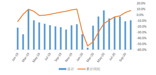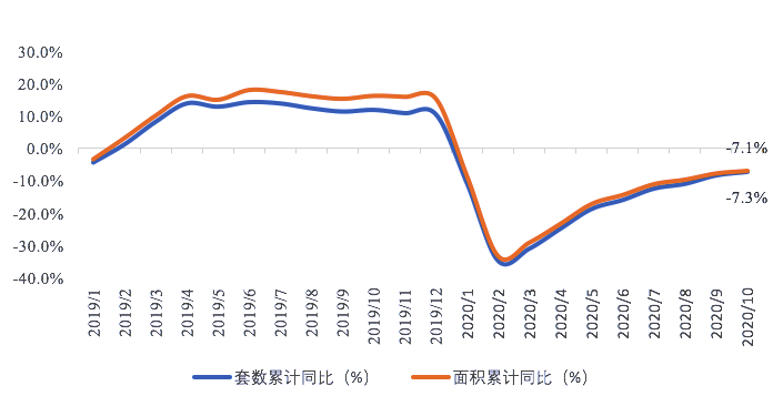貝殼研究院統(tǒng)計整理數(shù)據(jù)顯示,2020年10月66城新房市場合計成交套數(shù)單月同比增長2.6%,環(huán)比下滑13.7%,成交面積單月同比下滑0.5%,環(huán)比下滑12.9%。由于自7月以來,深圳、南京、杭州、成都等多城市出臺調(diào)控升級政策,預防出現(xiàn)過熱現(xiàn)象,10月成交量環(huán)比明顯下滑。1-10月66城新房市場累計成交套數(shù)同比下滑7.1%,成交面積累計同比下滑7.1%,較9月累計降幅收窄不到1.0個百分點,市場恢復速度持續(xù)放緩。