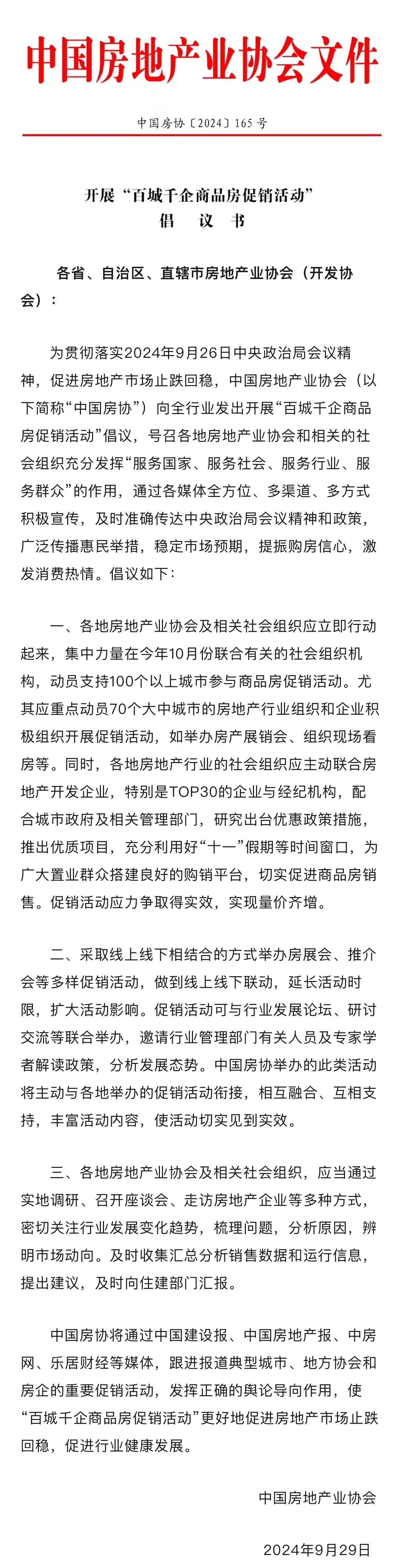 央廣網(wǎng)北京10月11日消息(記者安垚)據(jù)中國房地產(chǎn)業(yè)協(xié)會微信公眾號消息,為貫徹落實9月26日中央政治局會議精神,促進(jìn)房地產(chǎn)市場止跌回穩(wěn),在住房和城鄉(xiāng)建設(shè)部的指導(dǎo)下,9月29日,中國房地產(chǎn)業(yè)協(xié)會(以下簡稱“中國房協(xié)”)發(fā)出開展“百城千企商品房促銷活動”倡議。
