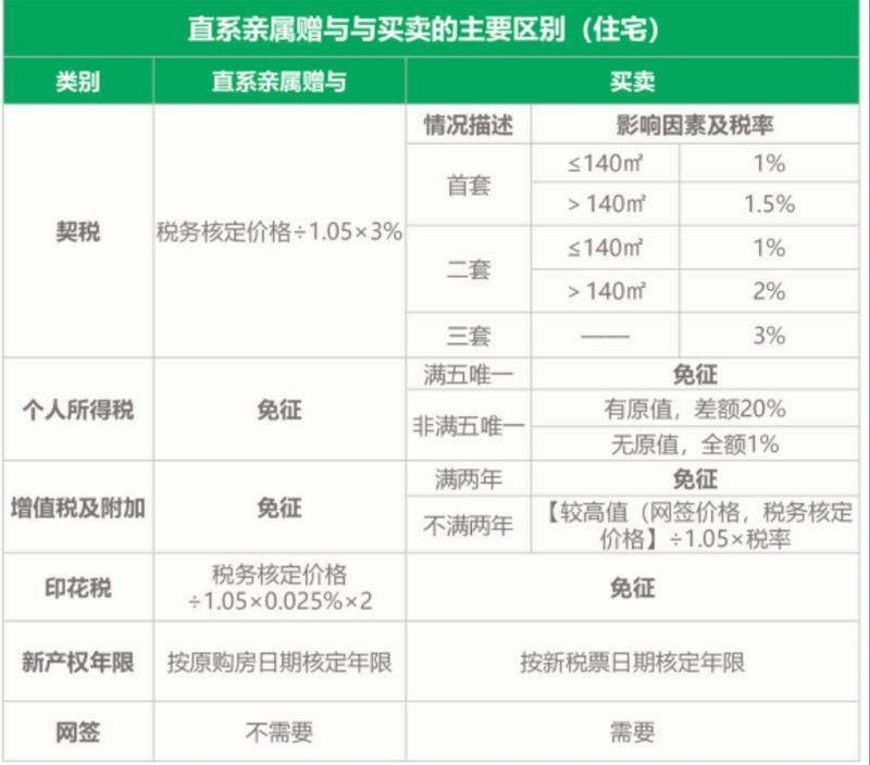 對此,北京鏈家簽約服務(wù)中心相關(guān)負(fù)責(zé)人表示,在直系親屬間進行房屋轉(zhuǎn)移(過戶)時,贈與和買賣是兩種常見的方式。雖然它們的目的相似,但在稅費方面卻存在顯著的區(qū)別。其中,贈與方式涉及契稅、印花稅,買賣方式則涉及契稅、個人所得稅、增值稅及附加、印花稅,具體可見下表。
