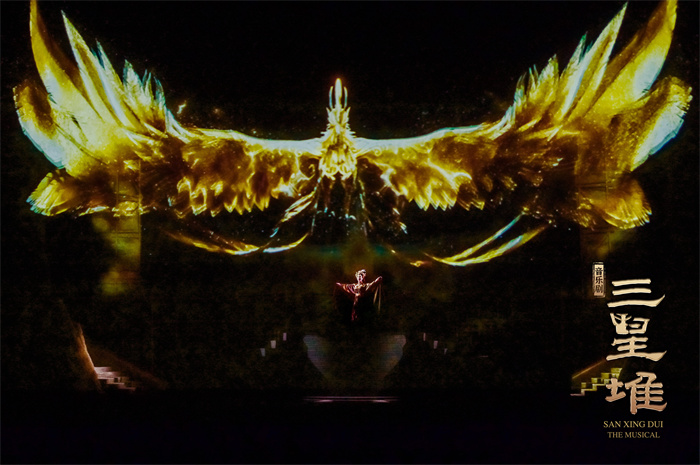 舞美設(shè)計由倫敦著名設(shè)計師摩根·拉知(Morgan Large)擔(dān)任,他曾獲2018年英國戲劇獎最佳設(shè)計獎和4次奧利弗獎、參與過《修女也瘋狂》《周日戀曲》等多部著名劇目舞美設(shè)計。舞美團(tuán)隊不僅力圖在色彩和道具上還原三千年前青銅王朝的璀璨與輝煌,還通過兩百余臺電腦燈呈現(xiàn)不同場景的光影效果。觀眾將非常幸運(yùn)地首次在音樂劇舞臺上,一次性看到青銅大立人、青銅大面具、青銅神樹等極具三星堆代表性文物的復(fù)刻版,加上極具沖擊力和感染力的多媒體技術(shù),生動展現(xiàn)了三千年前古蜀國的璀璨與輝煌。