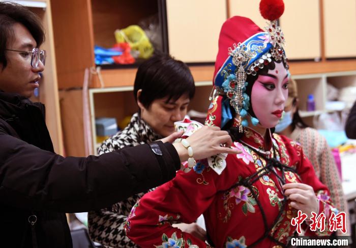 演出開始前,該劇主演劉泳渤在工作人員的協(xié)助下調整戲裝。 中新網記者劉可耕攝