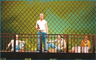 坐滿觀眾的劇場(chǎng),大幕拉開(kāi),燈光追隨,被判謀殺罪的銀行家安迪由獄警押解上場(chǎng)。身后的鐵牢籠里傳出起哄聲:“看吶,來(lái)新人了!”……