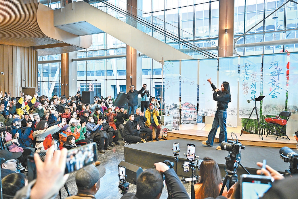 “嗩吶一響,黃金萬兩,新的一年,我給大家添添喜氣。”北京民族樂團(tuán)嗩吶演奏員王向陽熟練地向大家問了聲好。昨天下午,通州區(qū)遠(yuǎn)洋樂堤港行人不斷,一段《黃土情》在東區(qū)1層中庭里嘹亮吹響,很快,小舞臺前便里里外外圍了幾層人,還有不少觀眾放慢腳步,從樓上好奇地向下張望:王向陽帶三支嗩吶上臺,《百鳥朝鳳》吹得酣暢淋漓,二胡演奏員孫曉煜弓弦急動,《賽馬》氣勢奔騰,竹笛演奏員蔣錦雯用排簫吹起《月亮代表我的心》,溫柔舒展。約一個小時的演出,喝彩連連,掌聲不斷,周末時光被音樂溫暖點亮。