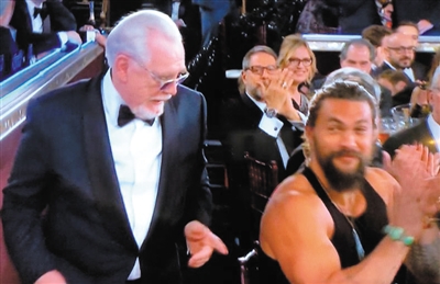 “海王”的扮演者杰森·莫瑪作為頒獎嘉賓今年首次亮相金球獎。此前,網絡上曝光了杰森為金球獎“精心打扮”的視頻,視頻中杰森身著藍綠色絨面禮服,由工作人員幫忙整理裝飾;杰森則興奮地甩動自己長而卷的頭發(fā)。然而頒獎典禮上,當鏡頭拍到臺下落座的杰森時,他不僅將頭發(fā)扎了起來,西服也不見蹤影,身上只穿著一件黑色背心,露出結實的肌肉。該一晃而過的鏡頭也成為今年金球獎最有趣的畫面之一。