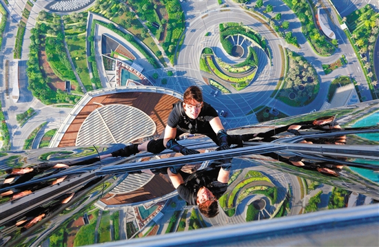 《碟中諜4》里,阿湯哥將自己“蜘蛛人”的愛好發(fā)揮到一個(gè)新高點(diǎn)。該片最大“名場面”便是阿湯哥徒手攀登迪拜塔,最后他還悠哉游哉地在迪拜塔頂拍了張“到此一游”照。