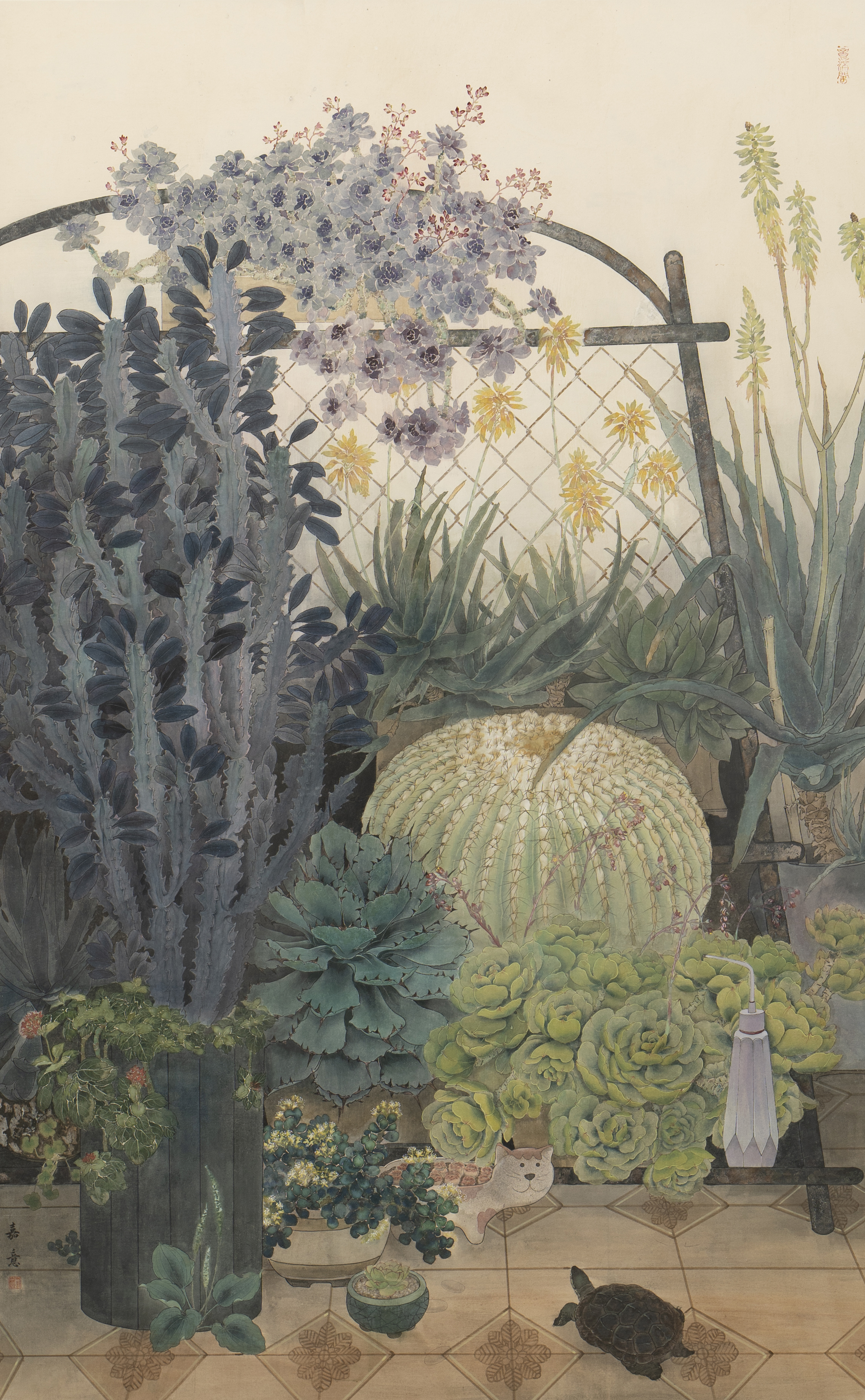 “生活是藝術(shù)創(chuàng)作的源泉”這句話,形容廣美中國畫學(xué)院的畢業(yè)生劉嘉意的作品很是貼切。這幅高1.8米的大畫《綠意空融》呈現(xiàn)的是綠意盎然的陽臺一角,這里生長著各式多肉植物,它們的原型是陪伴了作者大學(xué)四年生活的陽臺“多肉們”。為了豐富創(chuàng)作,劉嘉意去到了廣州芳村的花卉市場,還去到了學(xué)校附近的居民小巷,收集老廣們中意的多肉植物,比如作品中的龍骨,就是嶺南院落中常見的多肉植物品種?!岸嗳庵参锏纳L往往象征著生命,無論在什么地方,它們以塊根及葉片中的蛋白質(zhì)和水分得以生存。棱角和棘刺象征著它們的頑強(qiáng),對于我來說,是我大學(xué)生活中偶爾失落、疲憊的撫慰,也是堅定的陪伴。我想,這就是植物之于普通人的意義?!?劉嘉意說道。