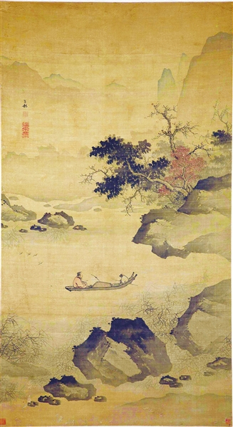 天博館藏明代蔣嵩的《秋江歸棹圖》軸,畫中遠山如黛,江面微微泛波,一葉小舟悠然浮在水面。船夫回頭張望,船尾一老者閑適地看書,任憑小舟在水中飄蕩。岸上有山石樹木,水邊有蘆葦叢叢,一派秋季的醉人風光。天博書畫研究部的李晶介紹:“畫面層次感很強,布局優(yōu)美,遠山近水、山石、樹木、蘆葦搭配得相得益彰。內(nèi)容豐富,意境簡淡,水墨厚重。山石兼皴帶染,筆墨滋潤?!?/p>