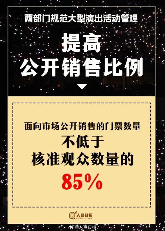 ?兩部門(mén)通知:①實(shí)名購(gòu)票、實(shí)名入場(chǎng)。5000人以上演唱會(huì)購(gòu)票人和入場(chǎng)人必須一致;②大型演出要設(shè)定梯次退票標(biāo)準(zhǔn);③公開(kāi)銷(xiāo)售門(mén)票不低于核準(zhǔn)觀眾數(shù)量的85%;④?chē)?yán)禁假唱、假演奏。更多↓↓↓詳戳,周知!